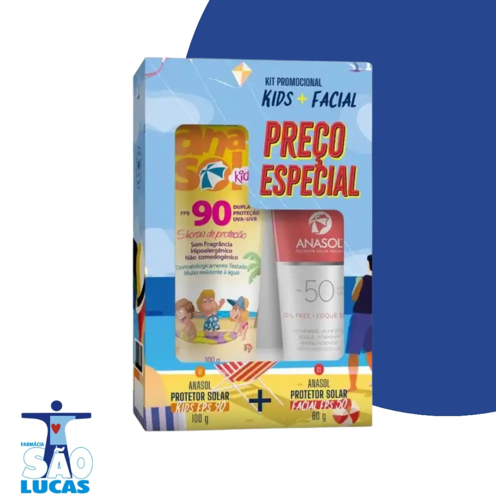Kit Anasol protetor solar Kids FPS90 + Protetor FPS50 Anasol. Você terá o poder de cuidar da sua pele como ela merece. Nossas fórmulas avançadas e exclusivas foram desenvolvidas para oferecer resultados imbatíveis, deixando você com uma sensação de frescor e confiança incomparáveis. Este conjunto de produtos não apenas oferece fórmulas veganas, mas também proporciona uma hidratação profunda, mantendo sua pele sequinha e protegida o dia todo.