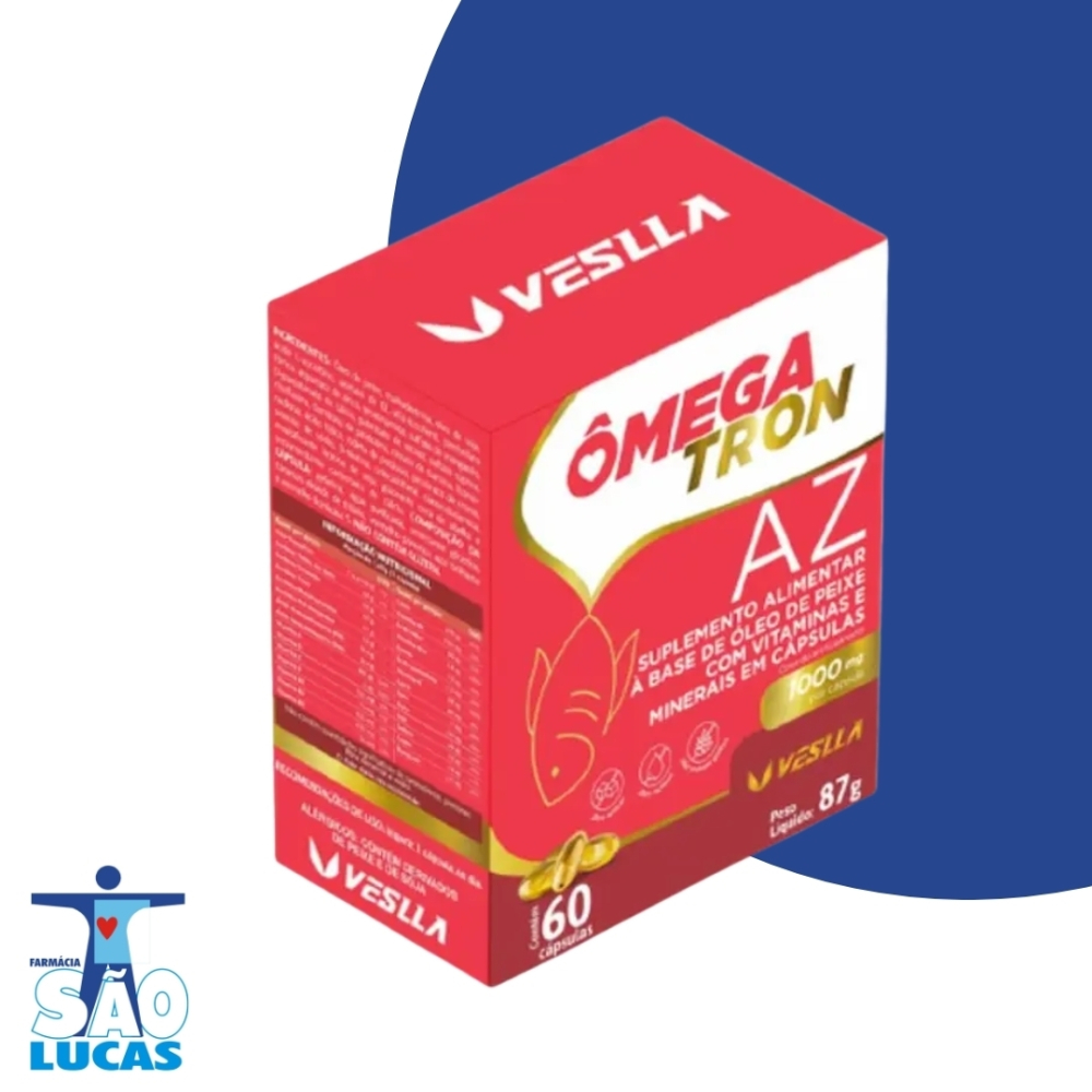 O Omegatron AZ é um suplemento alimentar completo, formulado com óleo de peixe, vitaminas e minerais essenciais para a manutenção da saúde. Cada cápsula contém 1650mg, sendo uma rica fonte de ômega 3, importante para o bom funcionamento do coração, cérebro e articulações.