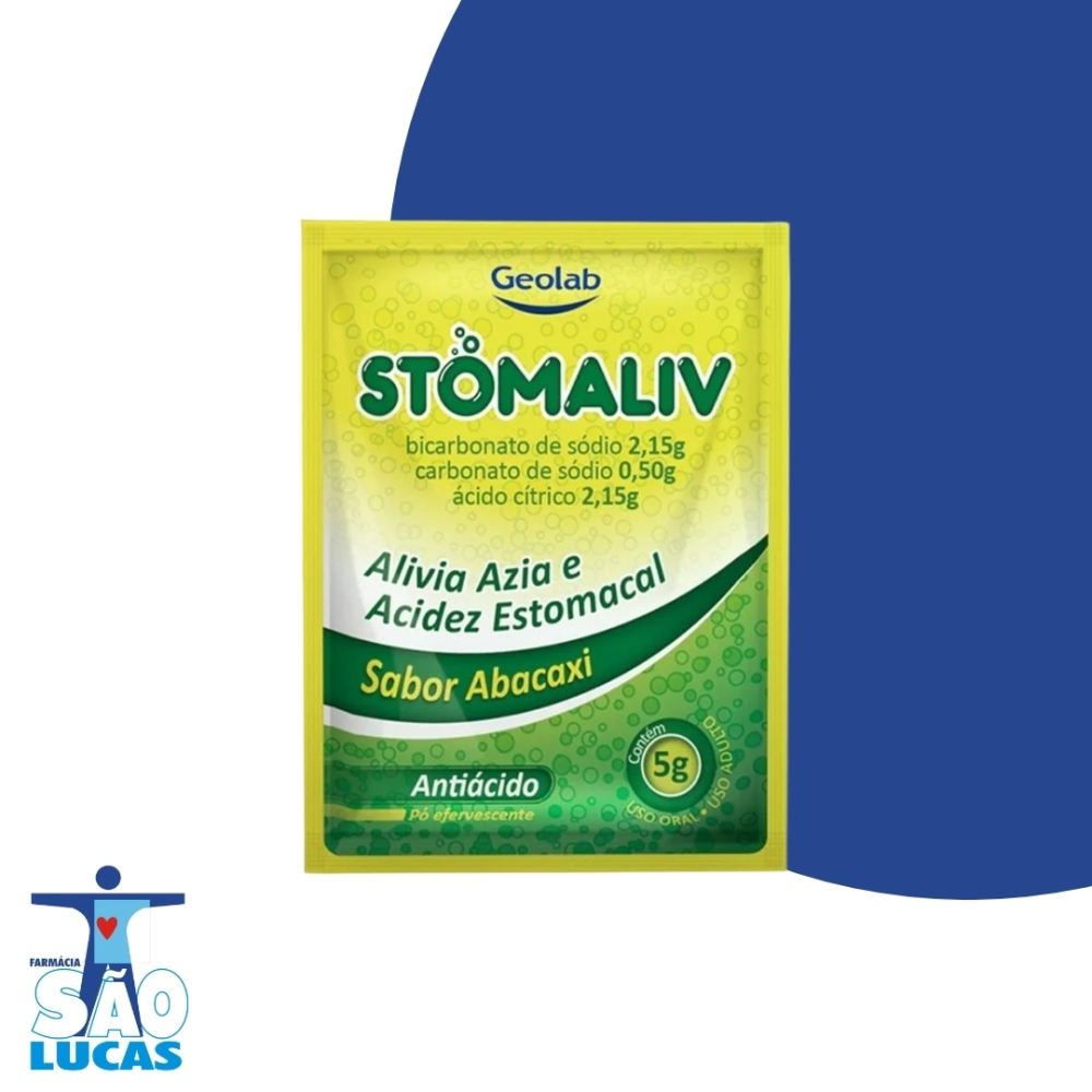 O Stomaliv 2,15g + 0,50g + 2,15g Sabor Abacaxi é um medicamento em pó efervescente, formulado como um antiácido eficaz para proporcionar alívio rápido e eficiente dos sintomas de azia e acidez estomacal. Sua fórmula, que combina bicarbonato de sódio, carbonato de sódio e ácido cítrico, reage em contato com a água para formar citrato de sódio, que atua neutralizando o excesso de ácido no estômago. Este processo ajuda a aliviar a sensação de queimação e o desconforto gástrico. O Stomaliv é uma solução prática para quem busca alívio imediato de problemas digestivos ocasionais, com um agradável sabor de abacaxi.