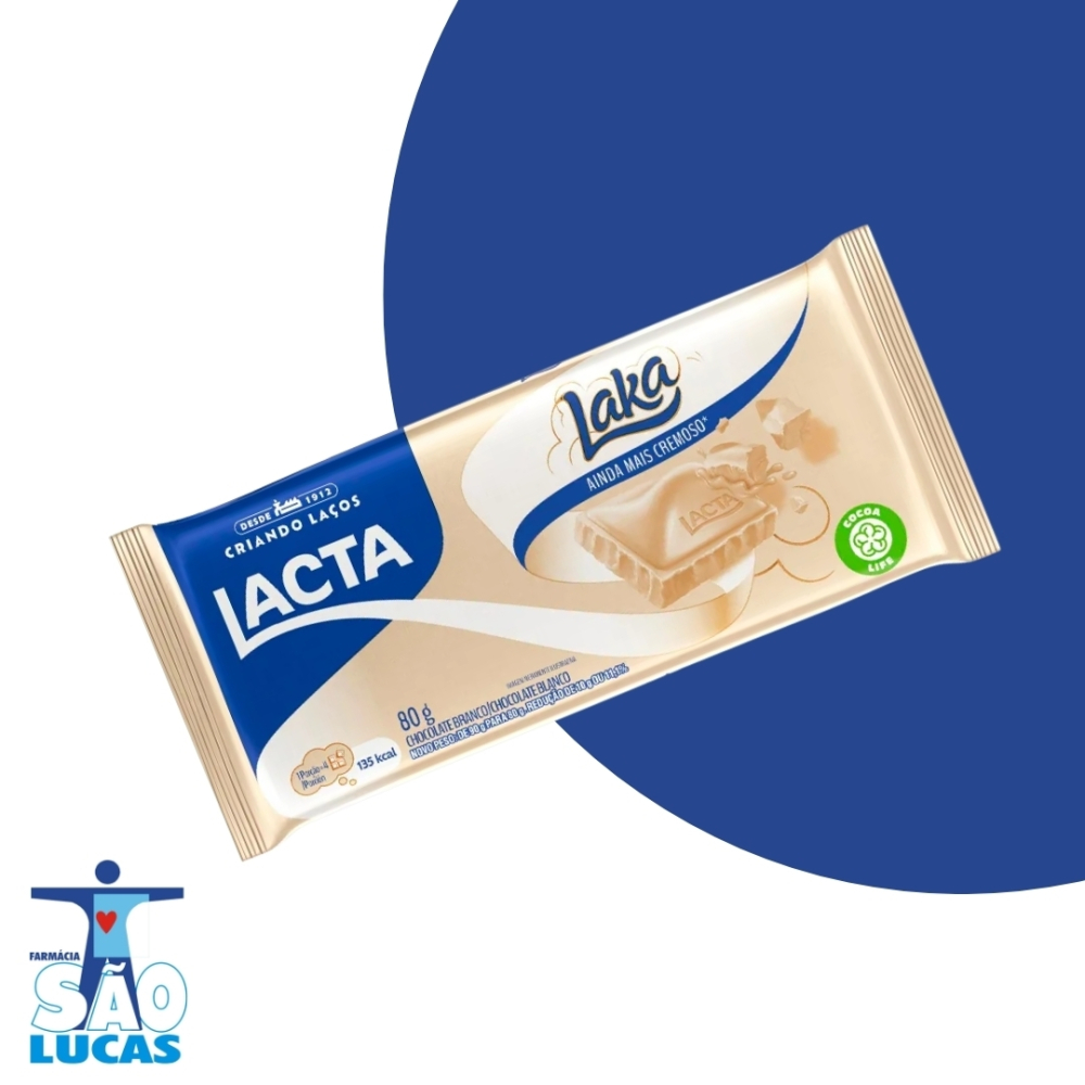 Barra de Chocolate Branco Laka - 80g A Barra de Chocolate Branco Laka é a escolha ideal para quem adora o sabor irresistível do chocolate branco. Com sua textura cremosa e suavidade, essa barra de 80g oferece uma explosão de doçura e leveza a cada mordida. É perfeita para um momento de indulgência, seja como lanche ou sobremesa. Produzida com ingredientes de alta qualidade, a Laka é famosa por seu sabor único, garantindo uma experiência deliciosa para quem busca um chocolate branco verdadeiramente cremoso. Ingredientes Açúcar, manteiga de cacau, leite em pó integral, gordura vegetal, soro de leite em pó, emulsificantes (lecitina de soja), aromatizantes. Contém leite e derivados, soja. Não contém glúten. Tabela Nutricional (porção de 25g - 1/3 da barra) Componente Quantidade por porção %VD* Valor energético 137 kcal 7% Carboidratos 14g 5% Proteínas 2g 3% Gorduras Totais 8g 15% Gorduras Saturadas 5g 24% Sódio 20mg 1% *% Valores Diários de referência com base em uma dieta de 2.000 kcal