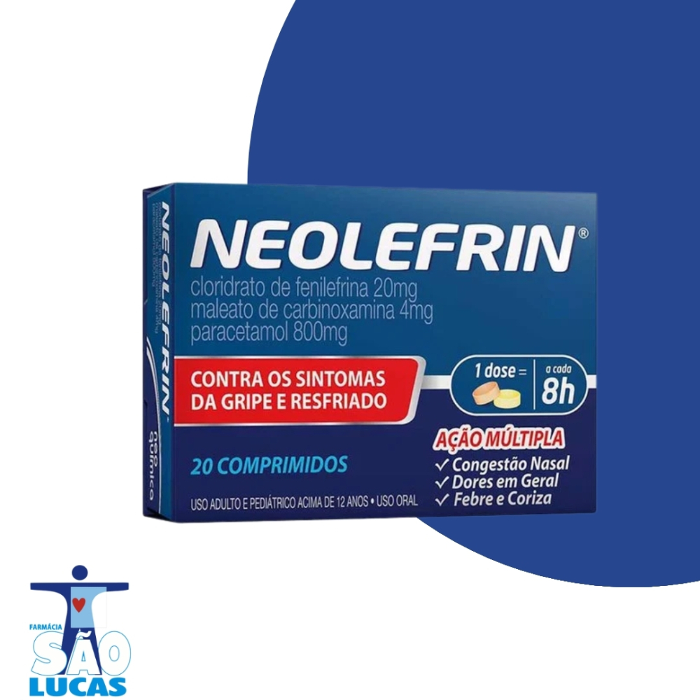 Neolefrin é um medicamento antigripal indicado para o alívio dos sintomas da gripe e resfriado em adultos e crianças acima de 12 anos. Sua fórmula combina paracetamol, cloridrato de fenilefrina e maleato de carbinoxamina, proporcionando ação analgésica, antitérmica, anti-histamínica e descongestionante nasal. Ideal para quem busca um tratamento eficaz contra dor, febre, congestão nasal e coriza, com início de ação rápido, cerca de 30 minutos após a ingestão. Recomenda-se a ingestão de dois comprimidos (um amarelo e um alaranjado) a cada 8 horas, sem ultrapassar 6 comprimidos em 24 horas. O tratamento não deve exceder 10 dias para dor e 3 dias para febre ou sintomas gripais. É importante seguir a prescrição médica e ler a bula antes do uso. Neolefrin não deve ser utilizado por pessoas alérgicas a qualquer componente da fórmula, menores de 12 anos, pacientes com glaucoma de ângulo estreito, hipertireoidismo, ou que fazem uso de antidepressivos inibidores da monoaminoxidase (MAO) e medicamentos hipertensores. O uso durante os primeiros três meses de gravidez é desaconselhado e, após esse período, deve ser feito sob orientação médica. Cada comprimido contém cloridrato de fenilefrina 20 mg, maleato de carbinoxamina 4 mg e paracetamol 300 mg. Apresentado em comprimidos orais, Neolefrin vem em embalagem com 20 unidades, com tarja vermelha e venda sob prescrição médica. Sua ação múltipla atua diretamente nas vias aéreas superiores, proporcionando alívio rápido e eficaz dos sintomas gripais, ideal para adultos e adolescentes que buscam conforto e recuperação rápida. Venda sob prescrição médica. Leia a bula antes de usar. Mantenha fora do alcance das crianças.