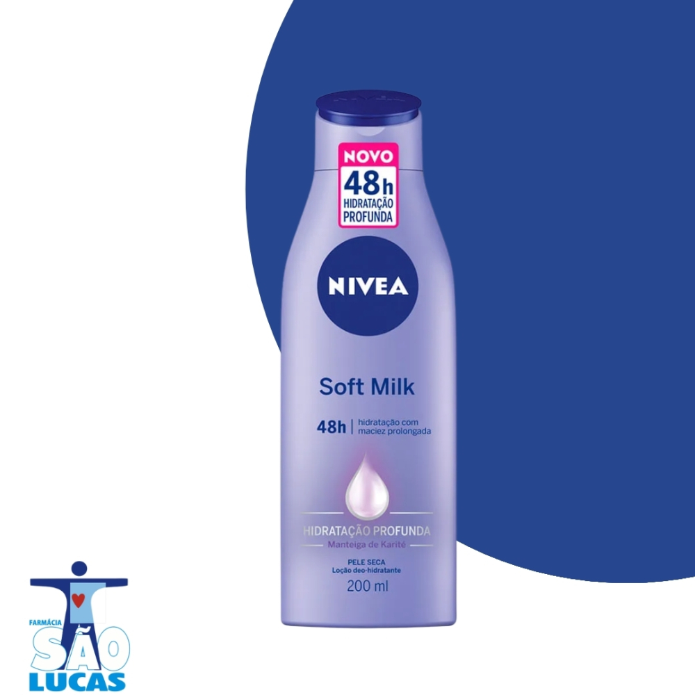 A Loção Hidratante Desodorante Corporal Nivea Soft Milk proporciona mais de 24 horas de hidratação, além de nutrir as peles secas, deixando uma gostosa sensação de suavidade. Sua fórmula com alto poder de hidratação, é rapidamente absorvida pela pele, sem deixar sensação de oleosidade. Contém o compostos que proporciona uma proteção eficiente contra o ressecamento da pele. Possui a exclusiva tecnologia Hydra QI- hidratação de dentro para fora por mais de 24 horas.
