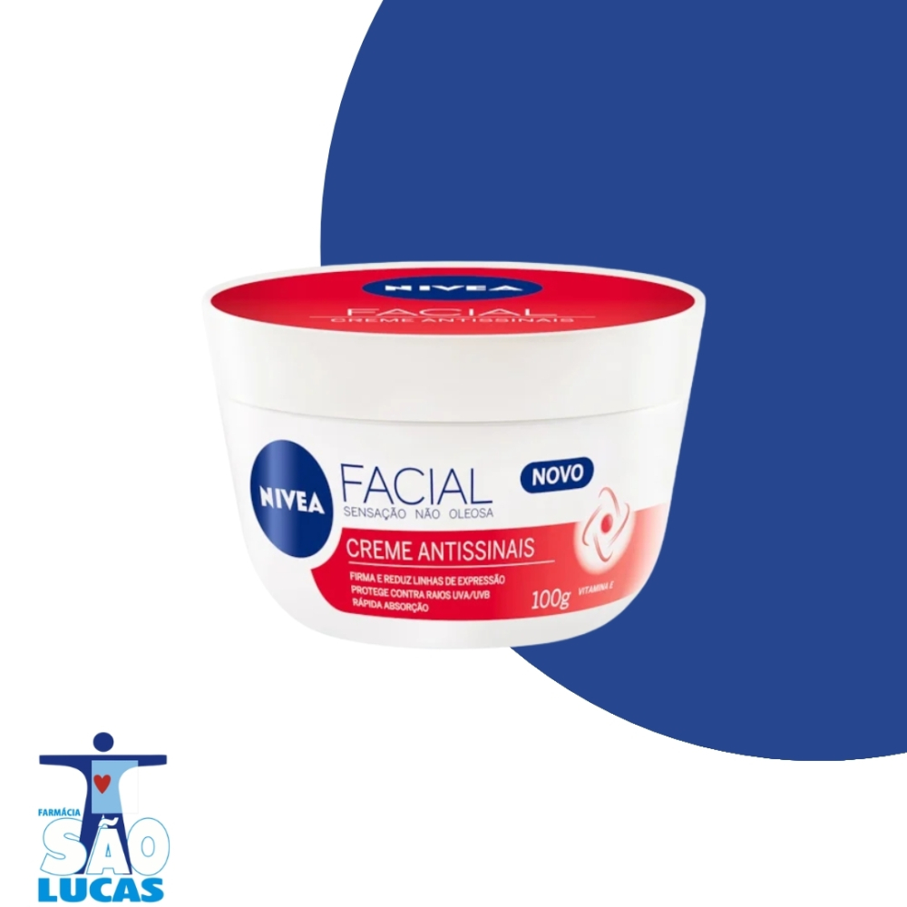 Com uma fórmula leve e de rápida absorção, este creme proporciona uma hidratação intensa de até 30 horas e o mais importante: sem deixar a pele com aspecto oleoso. Por possuir ingredientes hidro nutrientes e Vitamina E, Nivea Creme Facial Antissinais previne as rugas, melhora a cicatrização e ainda protege a pele contra os raios UVA/UVB.Além disso, sua fórmula exclusiva firma a pele e ainda reduz linhas de expressão, deixando-a muito mais jovem e saudável.