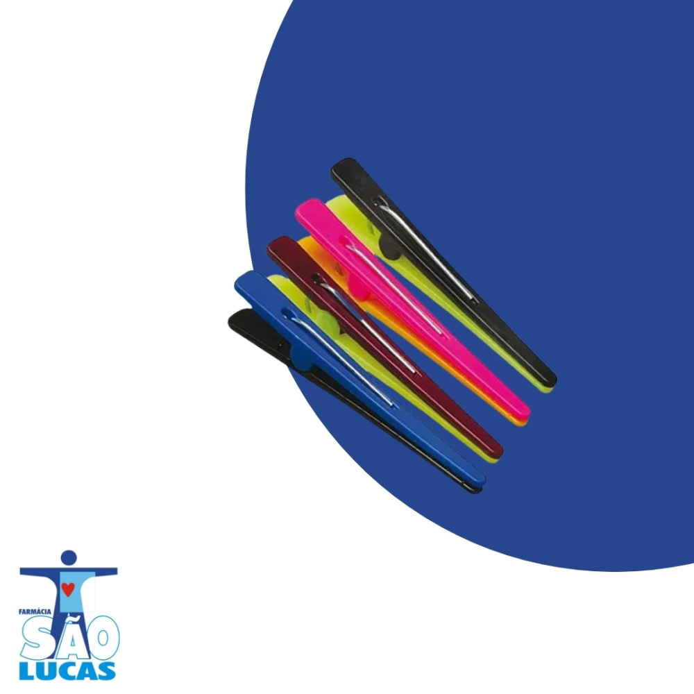 Os clips plásticos bicolor da santa clara são utilizados para prender os cabelos durante penteados, corte de cabelo, relaxamento, coloração, descoloração etc. Apresentam discretos relevos na parte interna do cabelo dando sustentação aos cabelos durante o procedimento. Medida: 11cm de Comprimento.