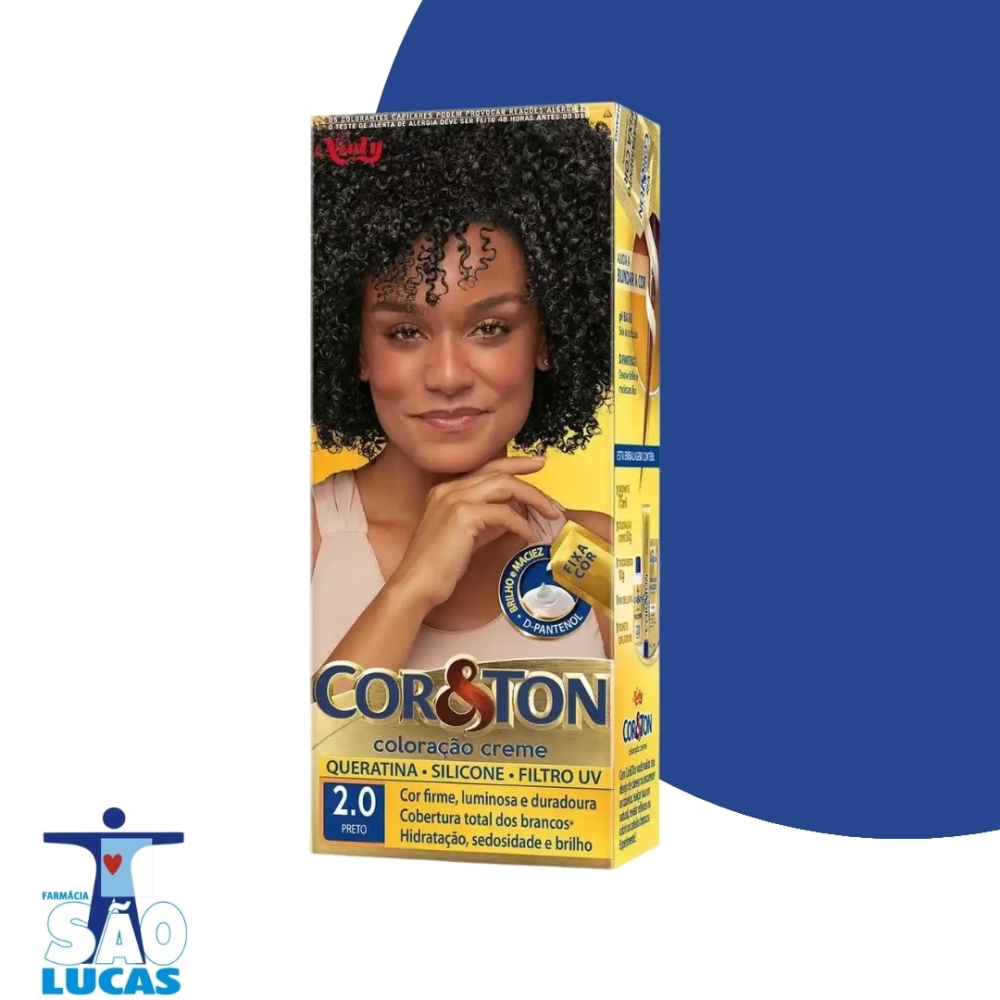 Com Cor&Ton você realiza seu desejo de clarear ou escurecer os cabelos, realçar sua cor natural, revelar reflexos ou cobrir os cabelos brancos. Experimente! A Tintura Creme Cor & Ton é uma coloração permanente com fórmula de altíssima qualidade. Oferece vários benefícios aos cabelos, proporciona aos cabelos cores vivas, luminosas e duradouras, total cobertura dos fios brancos. Hidratação, sedosidade e brilho. Com queratina, gérmen de trigo, silicone e filtro UV que garantem cabelos fortes, nutridos e com máxima proteção, possui textura cremosa, facilita a distribuição nos fios, fazendo com que os pigmentos sejam facilmente absorvidos. Coloque a tinta no frasco aplicador e agite bem até ficar homogêneo. Separe o cabelo e aplique da raiz as pontas e espalhe uniformemente em todo o cabelo (aplique a tinta com o cabelo seco). Retire o produto após 35 ou 40 minutos da aplicação. Para cabelo curto usar somente 1 Caixinha, para cabelo longo utilizar 2 caixinhas.