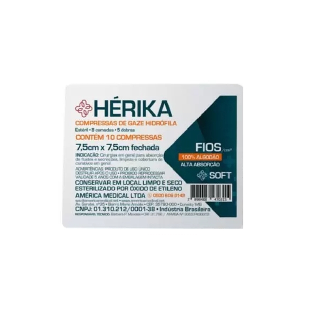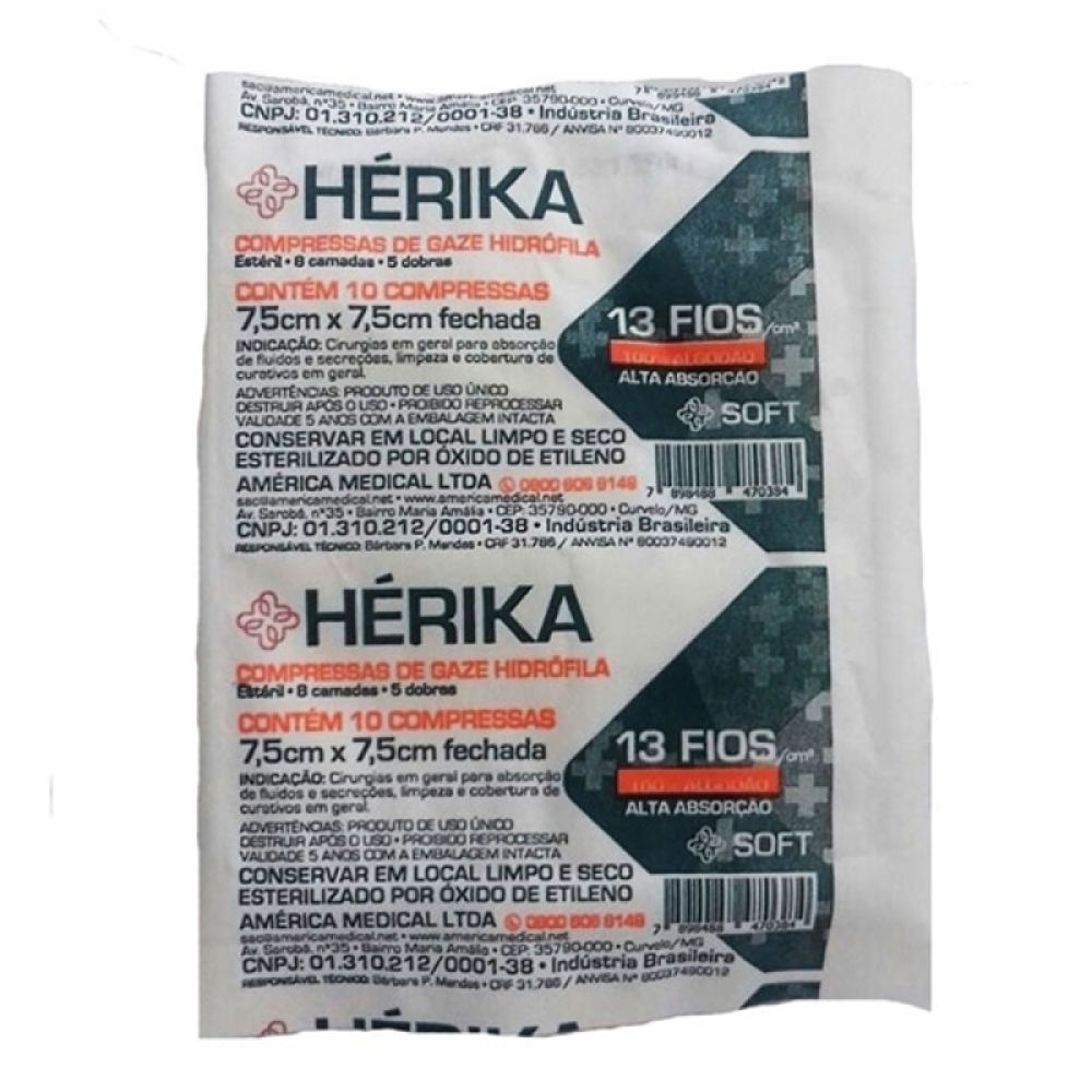 Sobre o Produto: - Tecido 100% algodão, plano, de baixa densidade de fios por centímetro, ligamento tafetá (tela), alvejado (isento de amido, corantes corretivos e alvejante óptico), inodoro e insípido com cinco dobras e oito camadas. Apresenta-se estéril e sem fio radiopaco firmemente fixado ao seu corpo; - Confeccionadas em tecido macio e neutro; - Altamente absorventes, isentas de impurezas; - Produto esterilizado por óxido de etileno; - Embaladas em envelopes de filme e PGC (papel grau cirúrgico); - Abertura asséptica em Pétala; - Produto fabricado no Brasil, com matéria-prima 100% brasileira. Indicação de Uso/Finalidade:A Compressa de Gaze Estéril Hérika Premium é indicada para cirurgias na absorção de sangue e secreções, barreira (hemostática) antiaderente na contenção de hemorragias, intervenções cirúrgicas e para curativos. Instrução de Uso:Abrir a embalagem através da técnica asséptica, pela pétala de abertura, para diminuir o risco de contaminação. Retirar as compressas de gaze da sua embalagem e aplicar sobre a área lesionada que necessite que o sangue e/ou as secreções sejam absorvidos ou sobre a área da ferida aberta ou em curativos de forma geral. * Imagem meramente ilustrativa