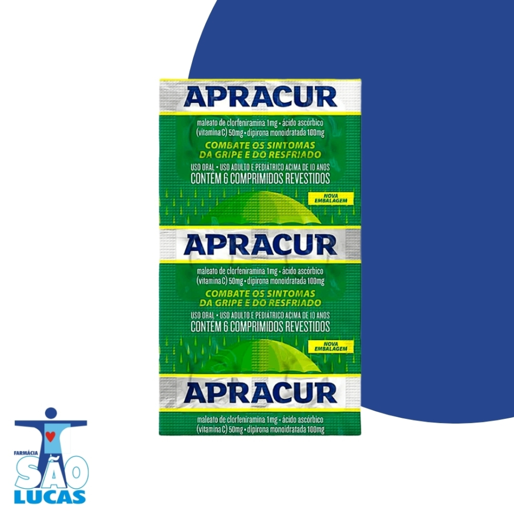 O Apracur 1mg + 50mg + 100mg 6 Comprimidos Revestidos é um medicamento que combina três princípios ativos para oferecer uma ação completa no combate aos sintomas de gripes e resfriados. Sua fórmula possui propriedades analgésicas para o alívio de dores, como dores de cabeça e dores no corpo, antipiréticas para a redução da febre, e antialérgicas, que ajudam a diminuir a coriza e o mal-estar. Apracur é indicado para o tratamento sintomático de diversas condições, incluindo gripe e resfriado, neuralgias, mialgias e dores reumáticas, proporcionando alívio e melhora do estado geral. Os sinais de melhora podem ser observados alguns dias após o início do tratamento.