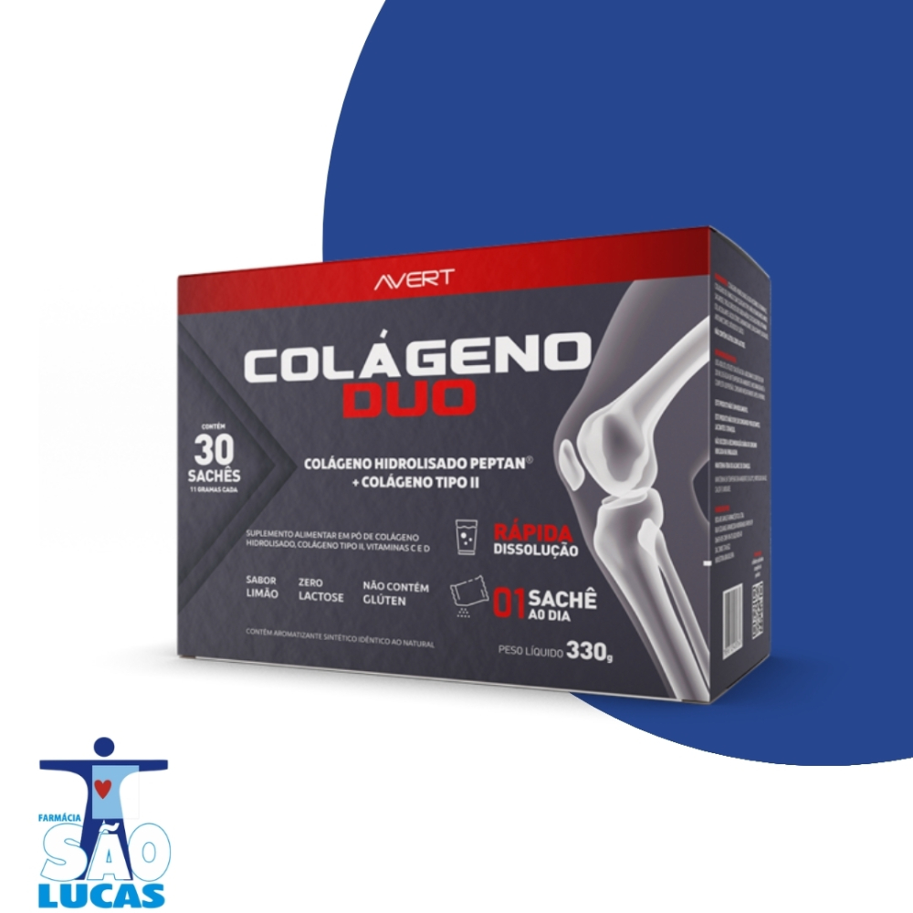 O colágeno Duo da Avert é um suplemento alimentar em pó com a presença de vitaminas em sua fórmula. Quais os benefícios do colágeno Duo Avert sabor limão O colágeno tipo II é responsável pelo auxílio na manutenção da função articular, além da vitamina C ajudar na formação do colágeno. Por fim, a vitamina D age no funcionamento muscular.Modo de usar o colágeno Duo Avert sabor limão: Consuma 1 sachê ao dia. Coloque o conteúdo do sachê em 200ml de água em temperatura ambiente. Misture bem até a completa dispersão. Consuma imediatamente após o preparo.