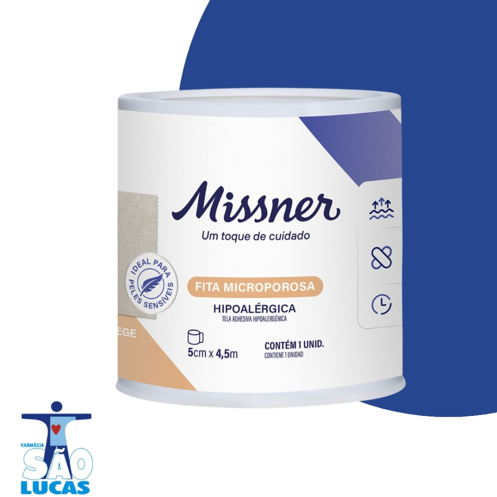 Fita Cirúrgica Microporosa, Bege, Hipoalérgica, 5 Cm X 4.5 M, Missner Permite a respiração da pele devido sua porosidade, evitando também a maceração da mesma. Oferece mais liberdade de movimentos por ser extra fina.