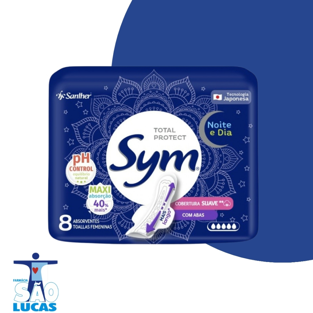 Os absorventes Sym Total Protect apresentam a tecnologia Odor Block com agentes neutralizadores de odores e 10 cápsulas de absorção para ajudar na distribuição do fluxo e bloquear vazamentos.